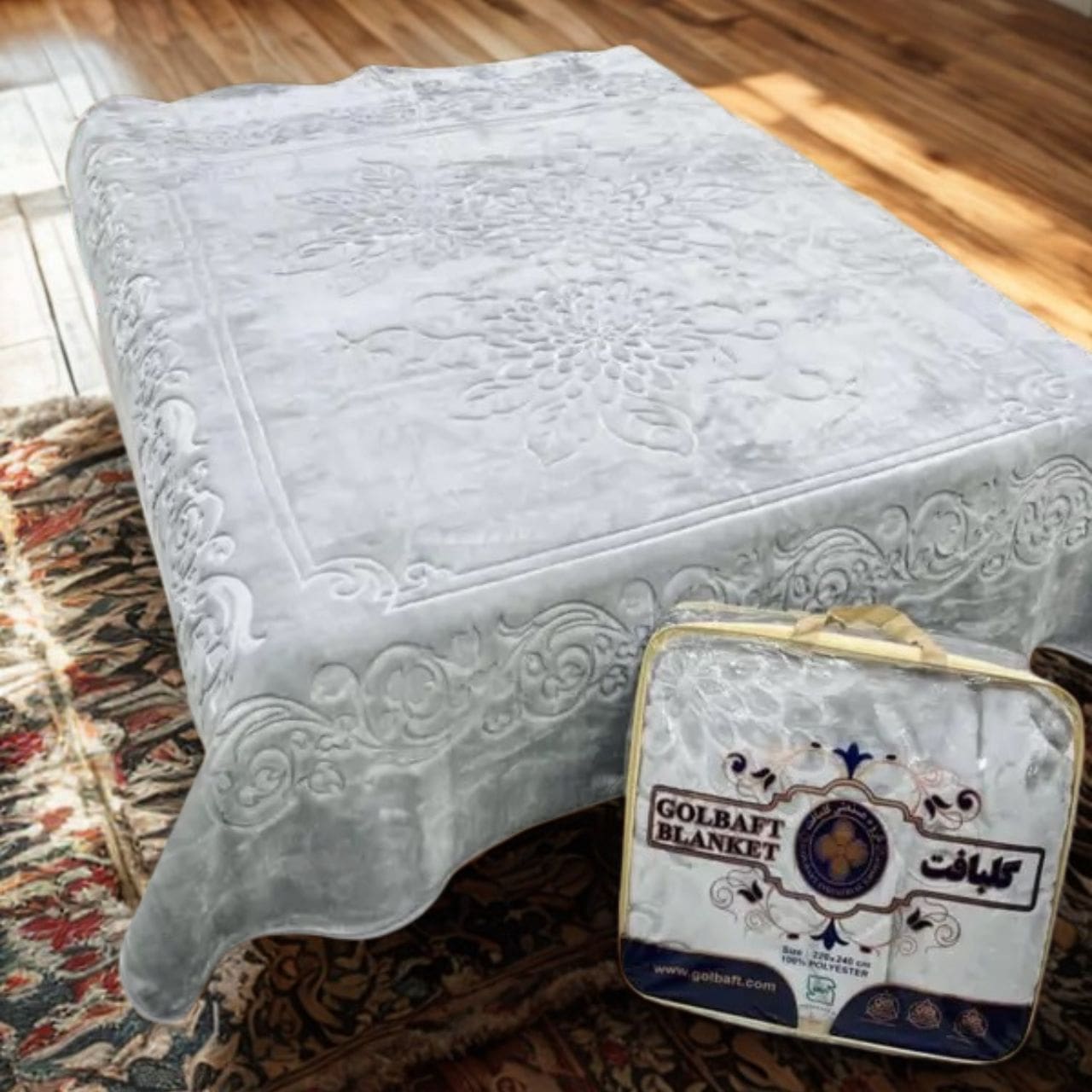 پتو گلبافت گل برجسته دونفره طوسی روشن – کد 35093، محصولی اصیل از برند معتبر گلبافت است. این پتو با سایز استاندارد ۲۴۰×۲۲۰ سانتیمتر و وزن تقریبی ۳۸۰۰ گرم تولید شده و از بافت راشل نرم و باکیفیت بهره میبرد. طرح گل برجسته و رنگ خاص طوسی روشن، جلوهای مدرن و آرامشبخش به اتاق خواب میدهد. این مدل برای فصول سرد سال مناسب است و با الیاف مرغوب خود گرما و لطافت بینظیری فراهم میکند.