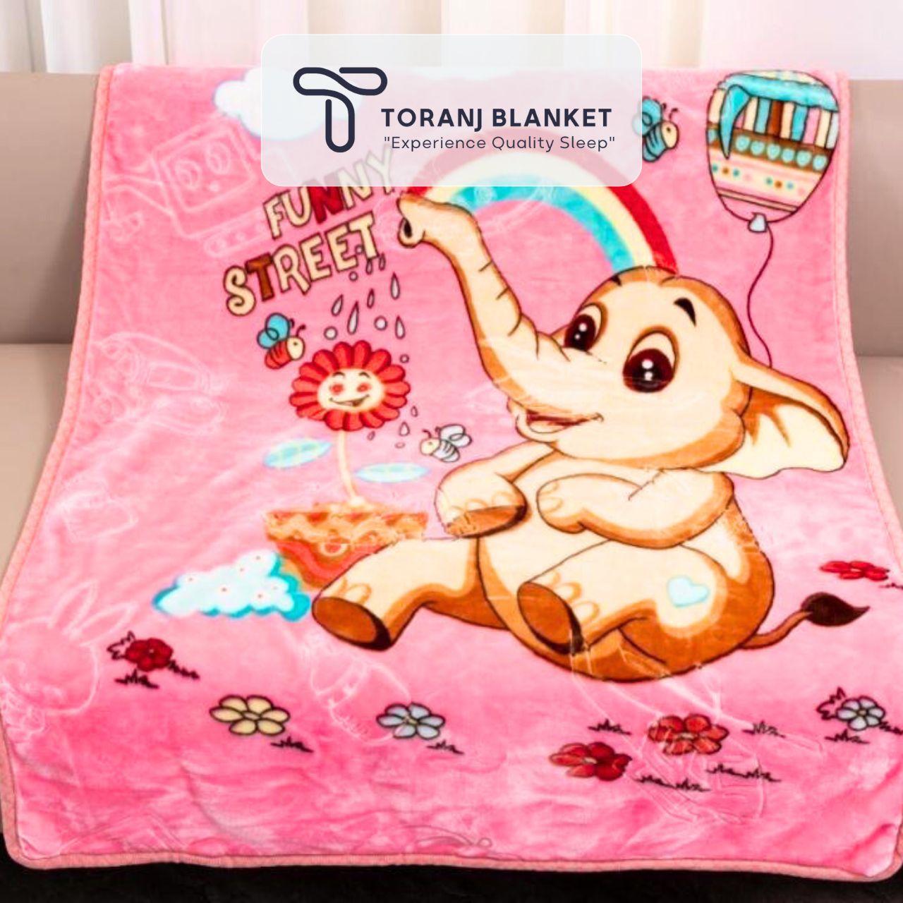 پتو کودک Sun High – کد 361 با طرح دوست‌داشتنی فیل صورتی و بافتی بسیار نرم و لطیف، حس آرامش و گرما را برای کودک فراهم می‌کند. رنگ صورتی آن فضایی شاد و دلنشین برای اتاق بچه ایجاد می‌کند و برای استفاده روزمره کاملاً مناسب است. وزن سبک پتو باعث می‌شود کودک در زمان استراحت احساس راحتی بیشتری داشته باشد.